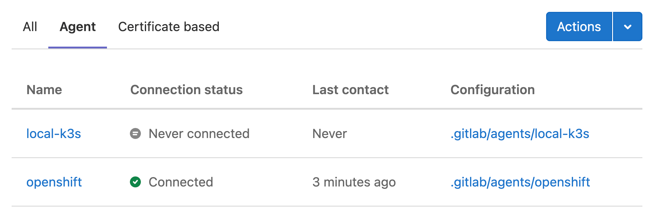 Users with at least the Developer can access the user interface for the Agent at Infrastructure > Kubernetes clusters, under the Agent tab. This page lists all registered agents for the current project, and the configuration directory for each agent: