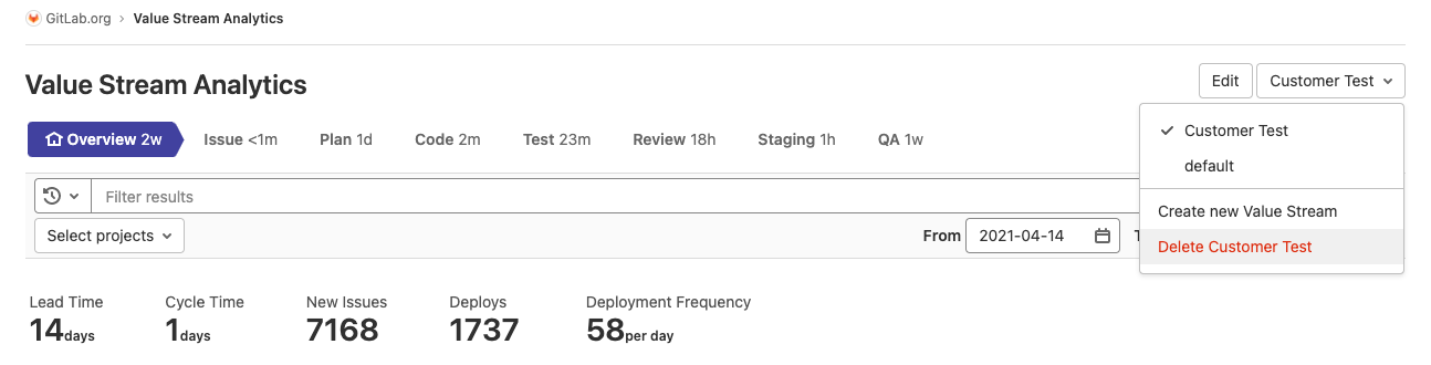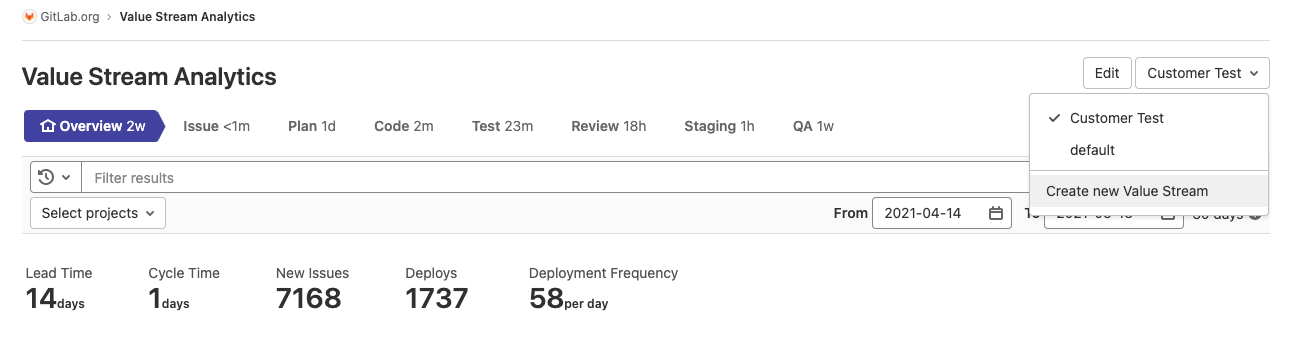 - On the left sidebar, select Analytics > Value Stream.