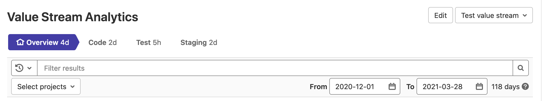 GitLab provides the ability to filter analytics based on a date range. Data is shown for workflow items created during the selected date range. To filter results: