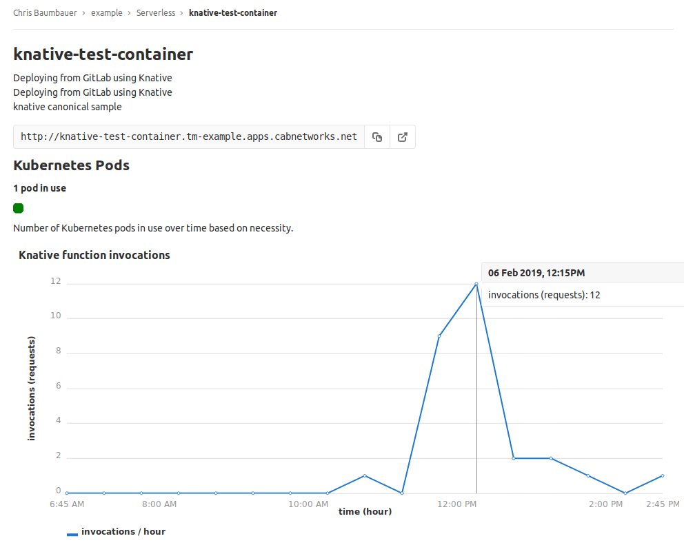 Optional: For invocation metrics to show in GitLab, additional Istio metrics need to be configured in your cluster. For example, with Knative v0.9.0, you can use this manifest.