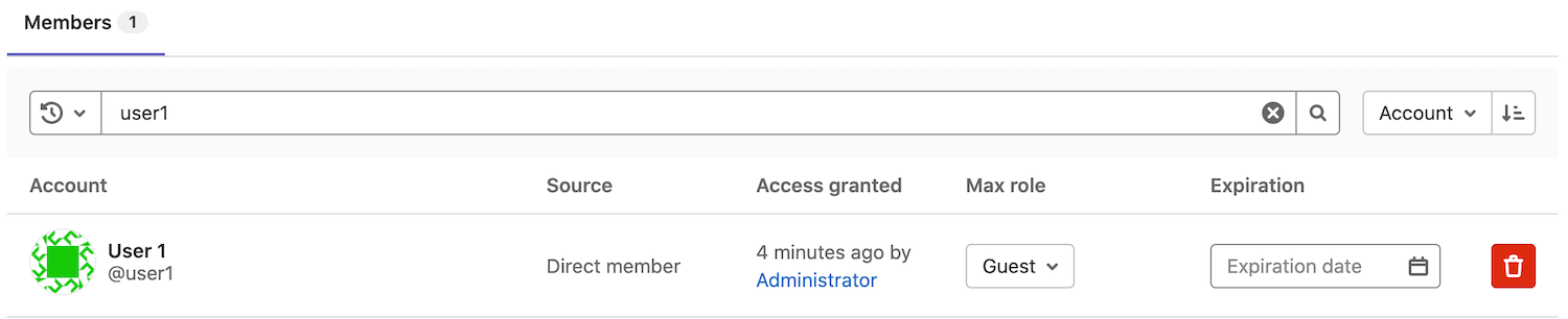 - User 1 belongs directly to the project. In the Source column, they are listed as a Direct member.