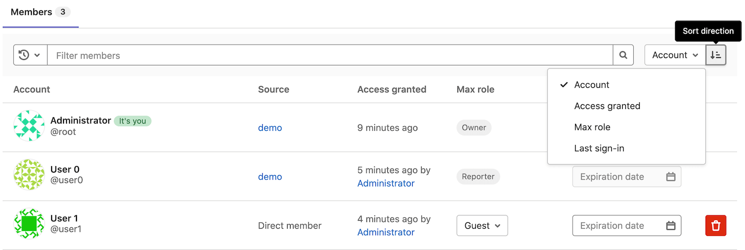 You can sort members by Account, Access granted, Max role, or Last sign-in in ascending or descending order.